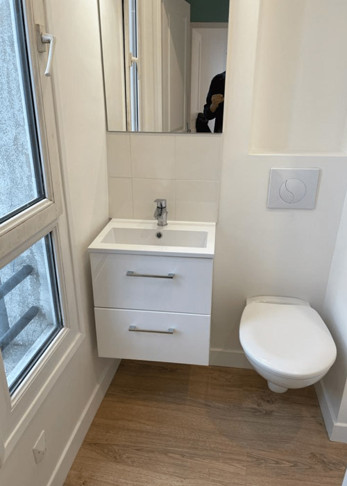 Les équipements en SDB ont été remplacés avec une montée en gamme : Le bac douche est agrandi (bien que contournant un conduit maçonné); l’ancien lavabo est remplacé par un meuble vasque. De même, la vieille cuvette WC a été remplacée par une nouvelle, disposée de manière différente et plus pratique.